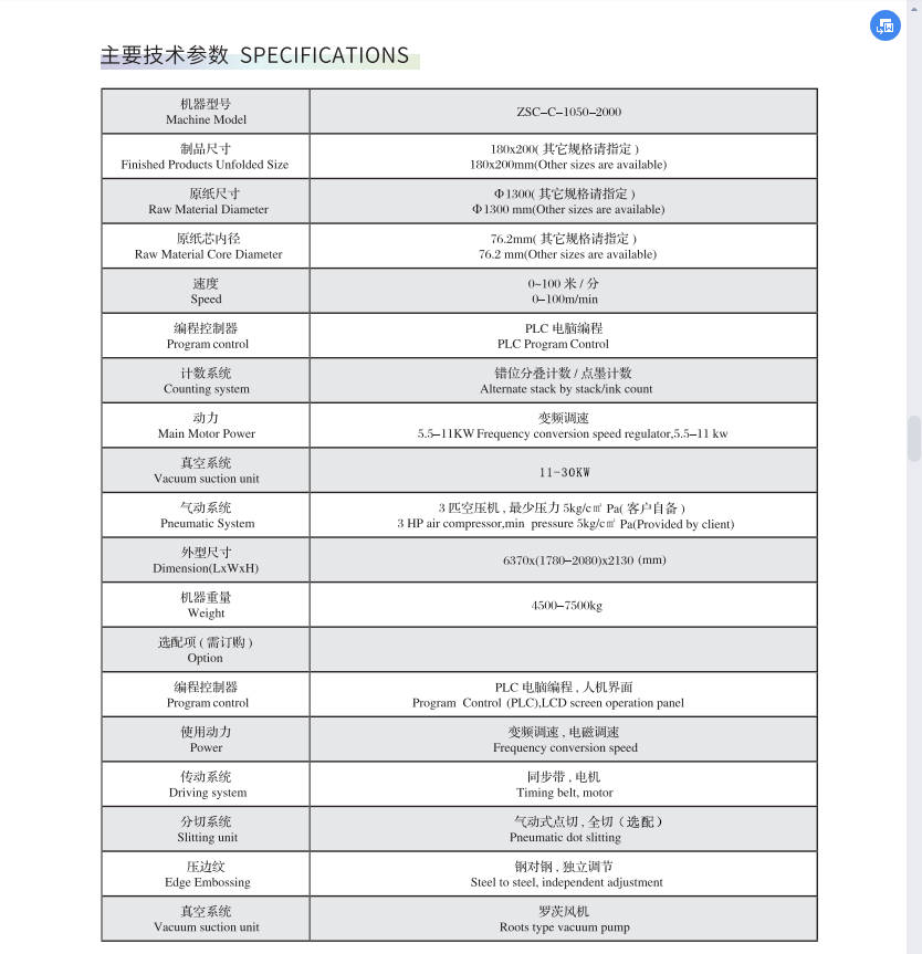 ZSC-C型面巾纸机采用PIC电脑编程技术,变频调速,及配置有触摸式人机界面操作系统,自主研发了远程通讯服务系统,可随时监控机械的运作情况;整机来用独立传动,设备适合多种原纸的需要,极大地提高了品质和效率。 主要特点 1、配置气动式钢对钢压花,气动式分离; 2、退纸架采用气动上纸、无级调节速比,调整不同纸质张力; 3、采用罗茨真空泵吸附系统,吸气量大,运行稳定; 4、可根据需要折叠不同宽度的成品,可选用点切或全切; 5、配置钢对钢压纹装置,确保双层面巾纸不分层; 6、可根据需要配置原纸对齐功能; 7、断纸自动停机系统,避免无纸或断纸产生废品; 8、采用前后点动开关牵引原纸,操作更简便、更安全;
