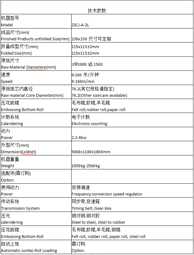 ZSCJ-A-2L型压花餐巾折叠机是将分切后的盘纸经过压花分切,自动折叠成方形或长方形的餐巾纸,该机采用电子计数跳级,保证张数的准确性,易于包装。压花辊采用加热调温装置,更令压花效果清晰定型。可根据不同需要配置折叠1/4、1/6、1/8折等规格的功能。